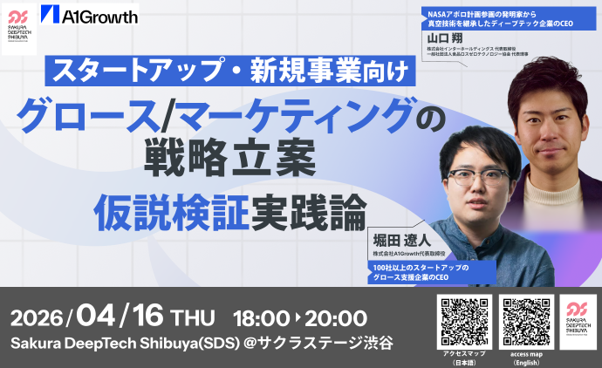 株式会社A1Growthとの共催により、スタートアップ・新規事業向けの実践講座「グロース/マーケティングの戦略立案 & 仮説検証実践論」を開催します。